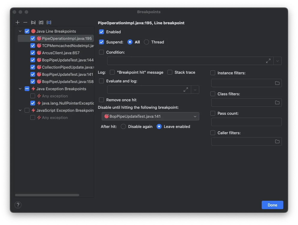 - ์๋ ์์ ํ๋ฉด๊ณผ ๊ฐ์ด, Disable until hitting the following breakpoint: ๋ฅผ ํ์ฉํด์ค๋ค.