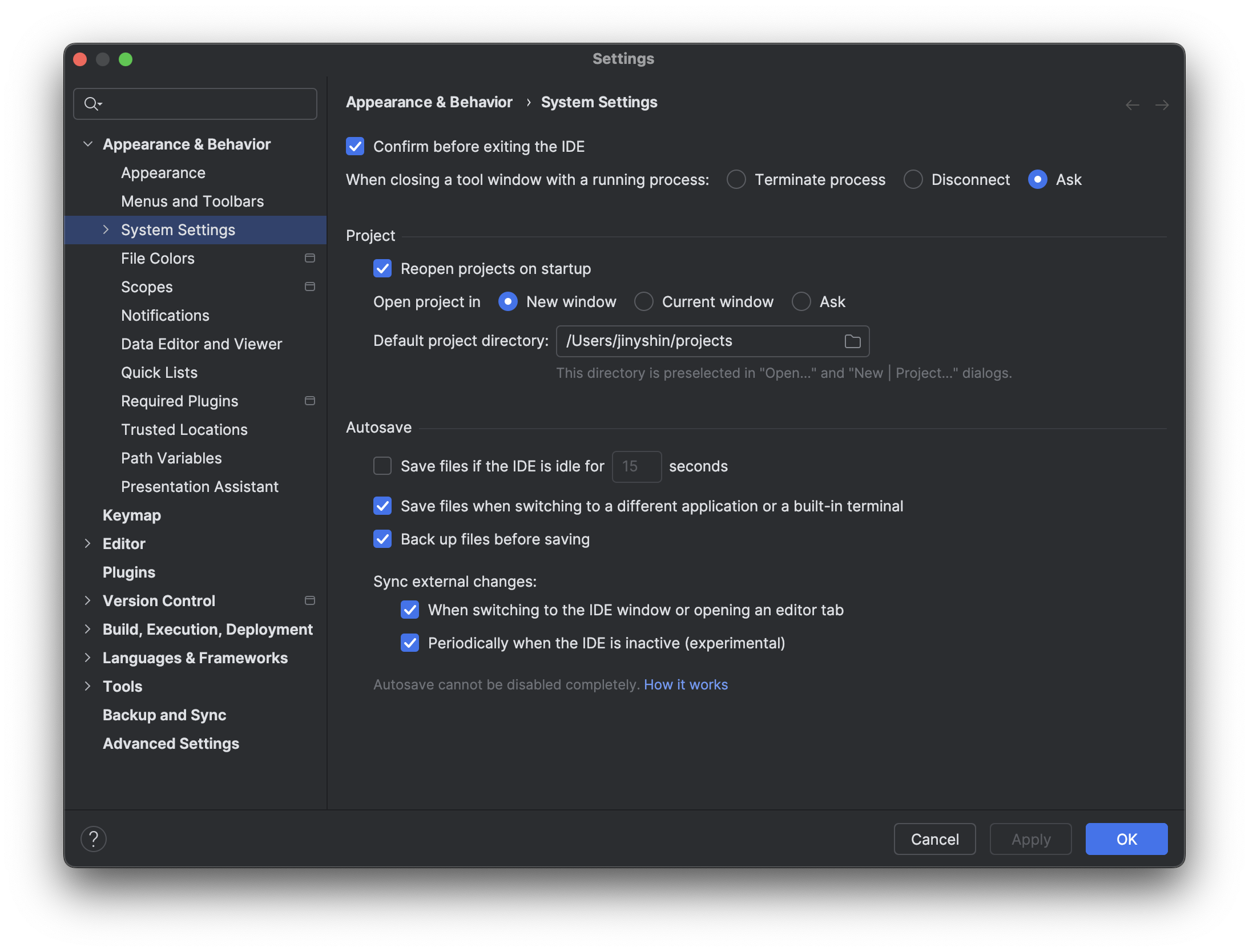- Settings... > Appearance & Behavior > System Settings > Project ๋ก ์ด๋